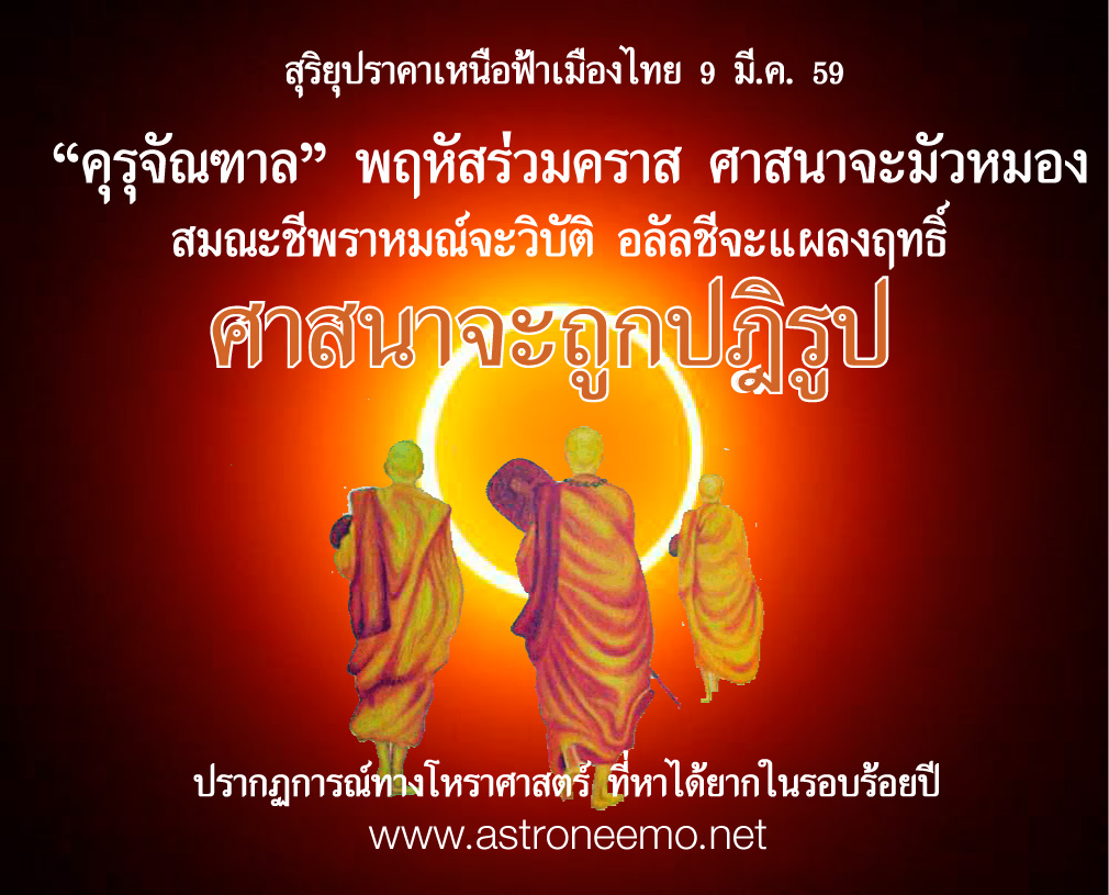 นับเป็นปรากฏการณ์ที่หาได้ยากทั้งของดาราศาสตร์และโหราศาสตร์ อันเนื่องมาจากการเกิดสุริยุปราคา สรรพคราสที่มองเห็นได้ในประเทศไทยอีกครั้ง ในวันที่ 9 มีค 2559 นี้ แต่ในทางโหราศาสตร์ปรากฏการณ์นี้มิใช่ธรรมดา เพราะการเกิดคราสในวันนี้ดาวพฤหัสได้โคจรเล็งกับจุดคราสพอดีแบบสนิทองศา ซึ่งหาได้ยากในรอบร้อยปี เรียกปรากฎการณ์นี้ว่า "คุรุจัณฑาล" หรือ คุรุ(ครู)ที่สูงส่งกลับกลายเป็นจัณฑาล(ที่ชั่วร้าย)